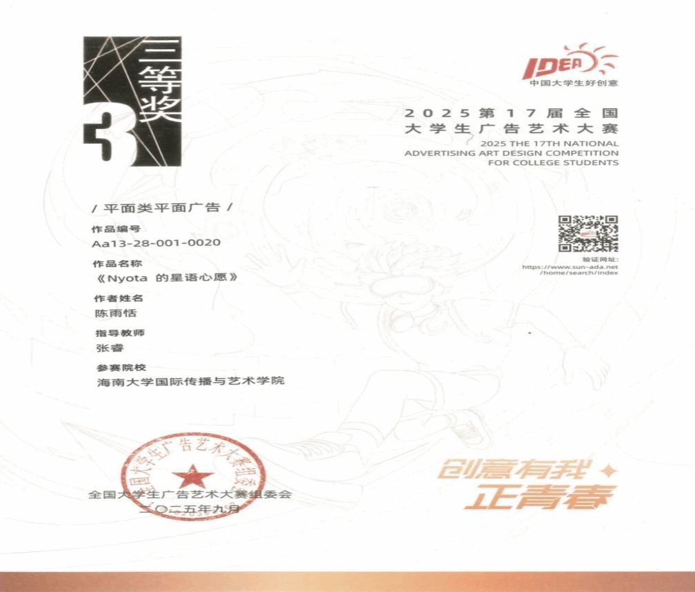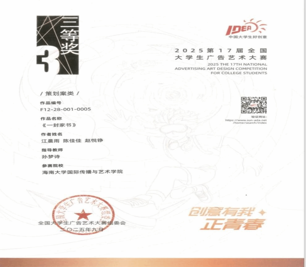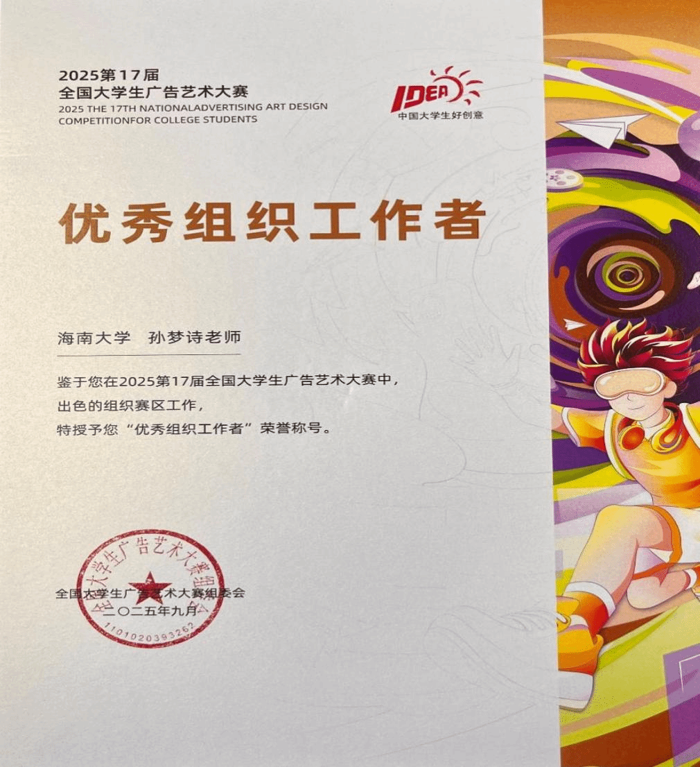 在本届大赛中,葡京赌场师生团队积极备赛、踊跃参赛,凭借扎实的专业功底与蓬勃的创造力,历经层层选拔与激烈角逐,斩获佳绩。其中,全国级奖项收获三等奖2项、优秀奖5项;省级奖项斩获一等奖6项、二等奖24项、三等奖35项,充分彰显了葡京赌场人才培养的扎实成效。同时,葡京赌场教师在赛事组织与区域推动工作中表现突出,获全国组委会高度认可—葡京赌场教师、大广赛海南赛区组委会秘书处孙梦诗,因卓越的组织协调能力被授予2025年度“优秀组织工作者”称号;葡京赌场教师、大广赛海南赛区负责人何晶娇,因在推动海南赛区成立、助力大赛走进海南高校、搭建省内外学子创意交流平台等方面的突出贡献,荣获 “最佳推动奖”,海南赛区同步获评“优秀赛区”称号。